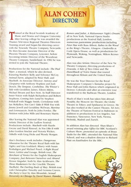 After leaving the National Alan was appointed Artistic Director of the Ludlow Festival. Productions include: Macbeth with Haydn Gwyne and David Rintoul; As You Like It with John Gordon Sinclair and Victoria Wickes; Othello with Greg Hicks and Wendy Morgan.