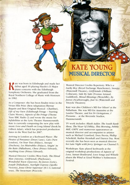 Kate was also Children’s MD for Oliver! at the Palladium. She was MD for Assassins at the Landor Theatre, and for Dr Livingstone, L Presume… at the Riverside Studios, Hammersmith.