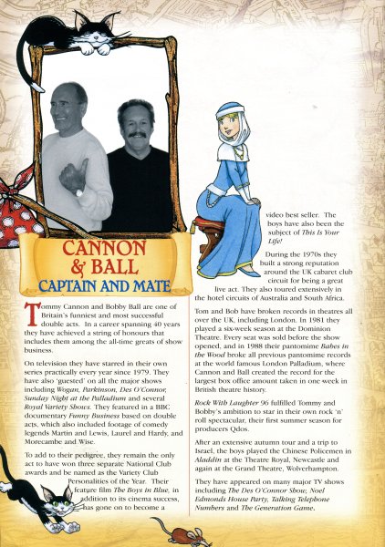 Tommy Cannon and Bobby Ball are one of Britain’s funniest and most successful double acts. In a career spanning 40 years they have achieved a string of honours that includes them among the all-time greats of show business.