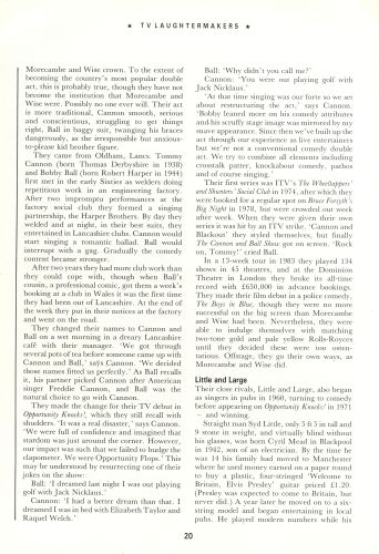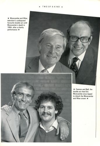 Cannon and Ball relate with pride that Eric Morecambe told them they would inherit the Morecambe and Wise crown. To the extent of becoming the country’s most popular double act, this is probably true, though they have not become the institution that Morecambe and Wise were. Possibly no one ever will. Their act is more traditional, Cannon smooth, serious and conscientious, struggling to get things right, Ball in baggy suit, twanging his braces dangerously, as the irresponsible but anxious- to-please kid brother figure.